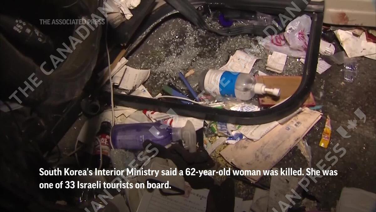 A busy carrying 35 people, mostly Israeli tourists, fell onto its side on a slope, killing one and injured dozens, in the southern South Korean city of Chengju. (April 14)