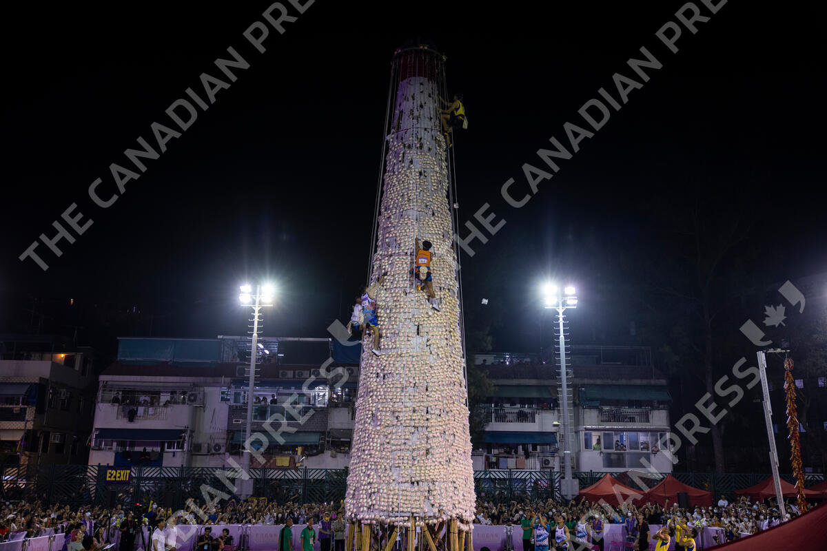 People take part in a bun scrambling competition during the Bun Festival in Cheung Chau Island in Hong Kong, Friday, May 26, 2023. (AP Photo/Louise Delmotte)