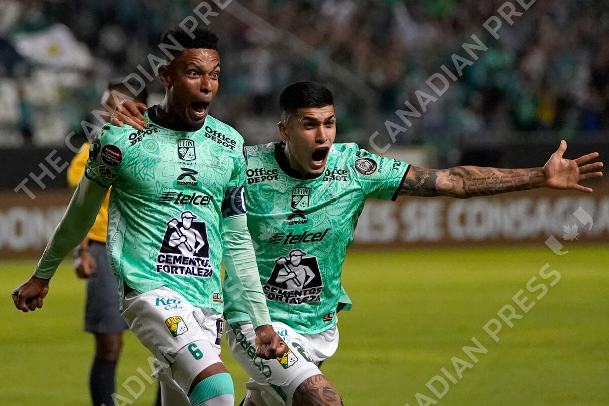William Tesillo of Mexico's Leon, left, celebrates with teammate Adonis Frias, after scoring his team's first goal against Los Angeles FC during the first leg of the CONCACAF championship final soccer match at Leon stadium in Guanajuato, Mexico, Wednesday, May 31, 2023. (AP Pho to/Eduardo Verdugo)