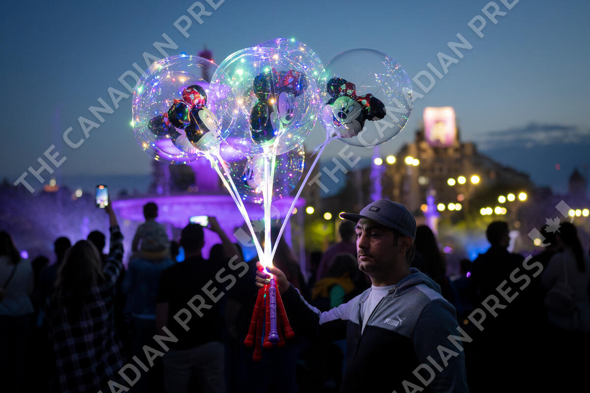 A man sells balloons as people watch a light and music show by city fountains in Bucharest, Romania, Saturday, May 20, 2023. (AP Photo/Vadim Ghirda)