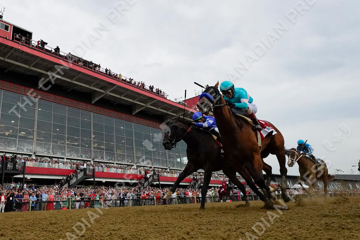 National Treasure, right, with jockey John Velazquez, edges out Blazing Sevens, with jockey Irad Ortiz Jr., to win the148th running of the Preakness Stakes horse race at Pimlico Race Course, Saturday, May 20, 2023, in Baltimore. (AP Photo/Julio Cortez)