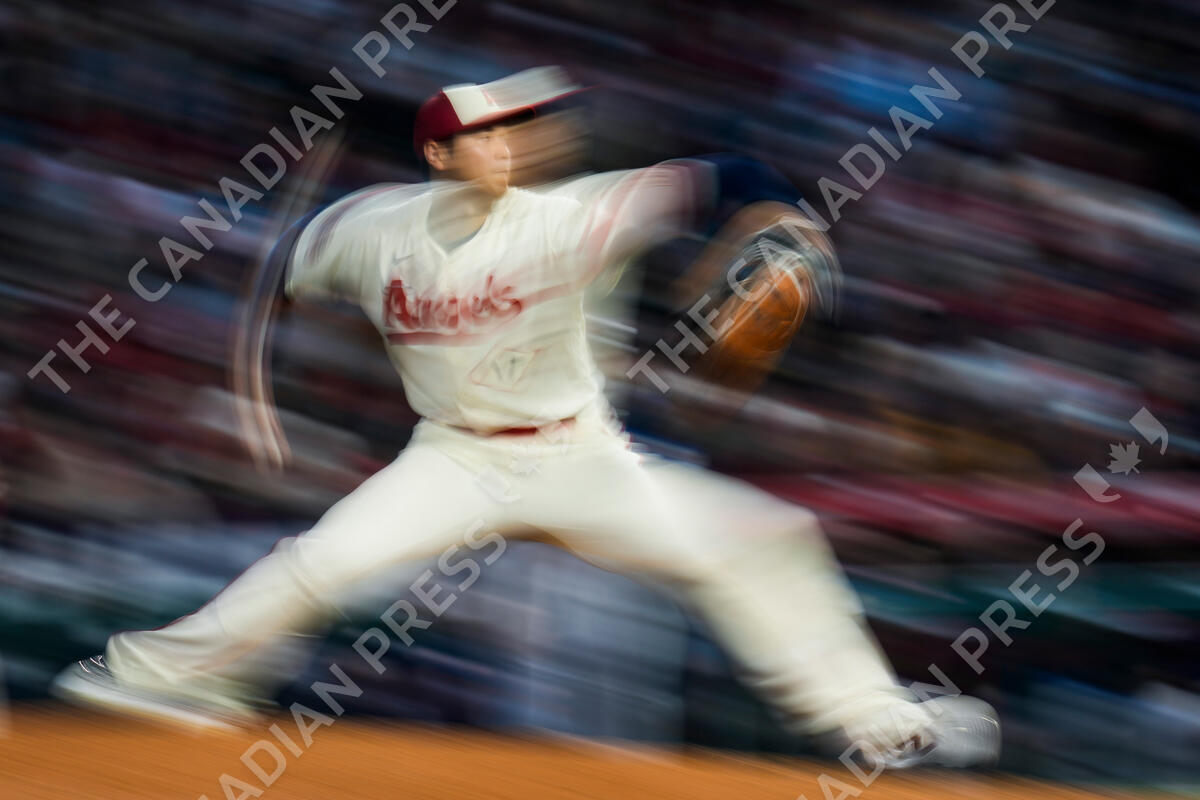 Los Angeles Angels starting pitcher Shohei Ohtani (17) throws during the fifth inning of a baseball game against the Houston Astros in Anaheim, Calif., Tuesday, May 9, 2023. (AP Photo/Ashley Landis)