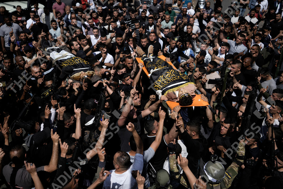Mourners carry the bodies of Ahmed Assaf, 19, right, and Rani Qatanat, 24, left, draped in the flag of Islamic Jihad, two Palestinians killed by Israeli forces in Qabatiya, near the West Bank city of Jenin, Wednesday, May 10, 2023. The Israeli military said that Palestinian gunmen opened fire at troops in the Palestinian town of Qabatiya in the northern West Bank during an army raid. Troops returned fire, killing the two men, and confiscated their firearms, it said. (AP Photo/Majdi Mohammed)