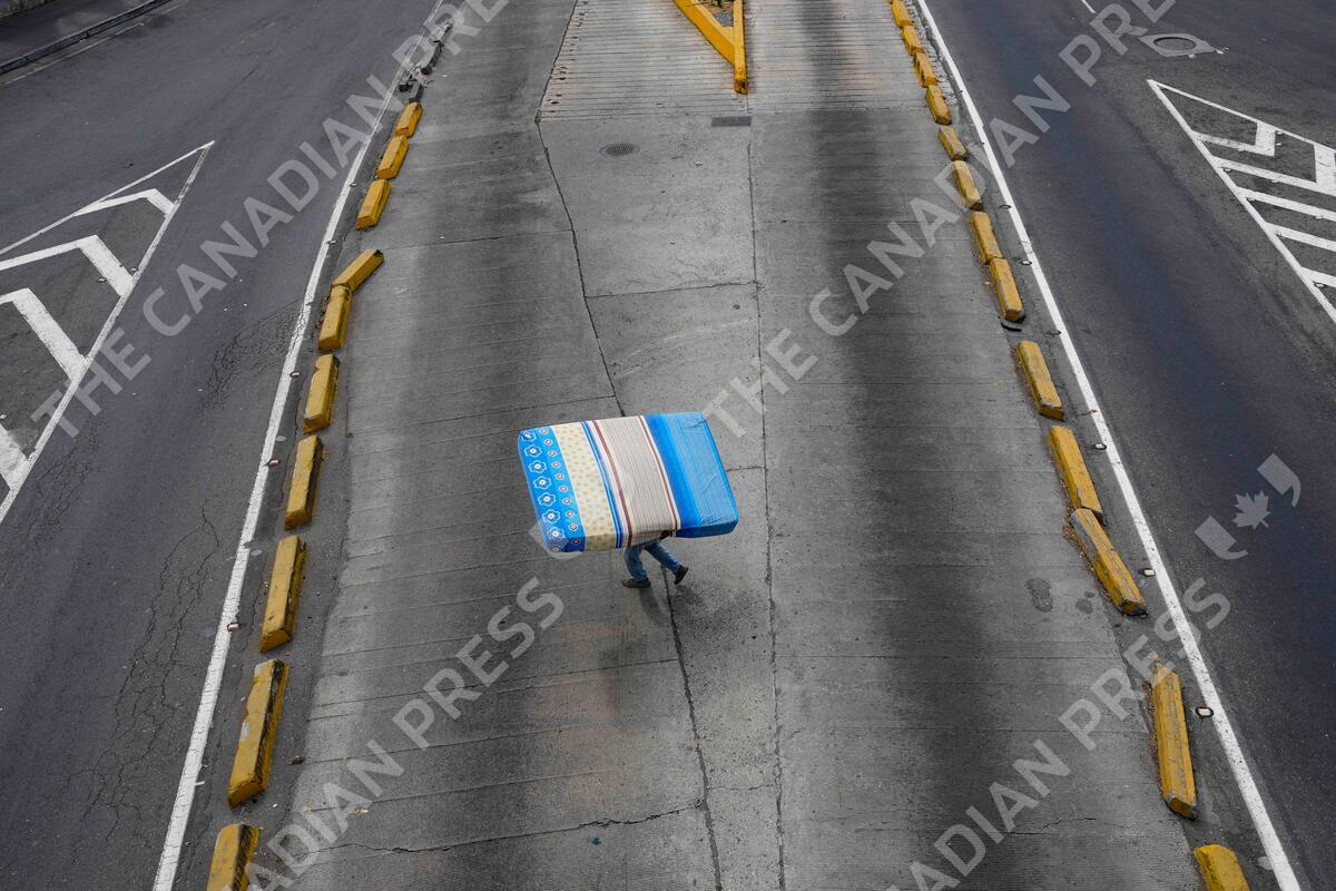 A man carries a mattress as he crosses a street near to La Bandera terminal bus in Caracas, Venezuela, Sunday, May 7, 2023. (AP Photo/Matias Delacroix)