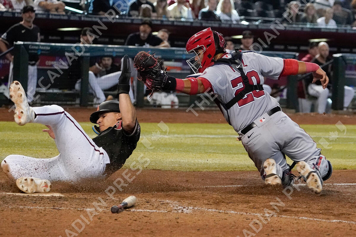 Arizona Diamondbacks' Alek Thomas, left, is tagged out at home by Washington Nationals catcher Keibert Ruiz in the seventh inning during a baseball game, Sunday, May 7, 2023, in Phoenix. (AP Photo/Darryl Webb)