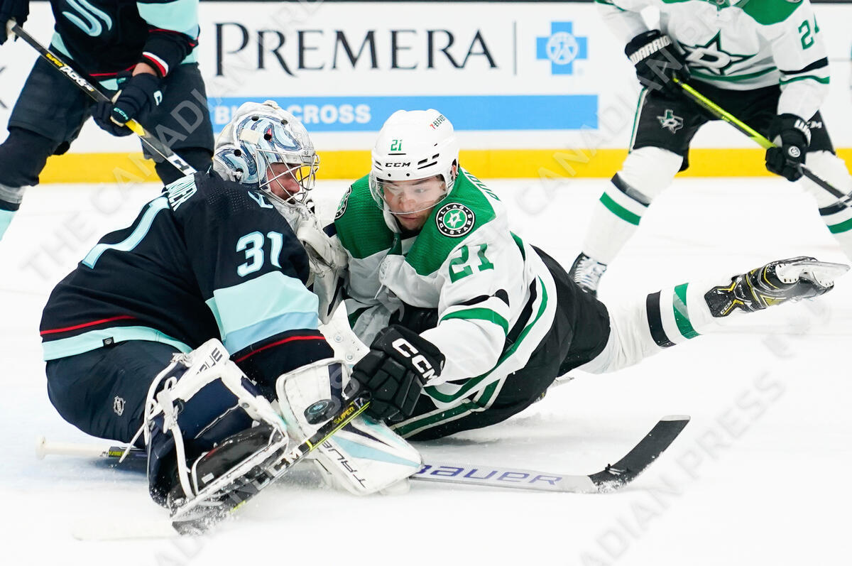 Seattle Kraken goaltender Philipp Grubauer (31) blocks the puck against Dallas Stars left wing Jason Robertson (21) during the second period of Game 3 of an NHL hockey Stanley Cup second-round playoff series Sunday, May 7, 2023, in Seattle. (AP Photo/Lindsey Wasson)