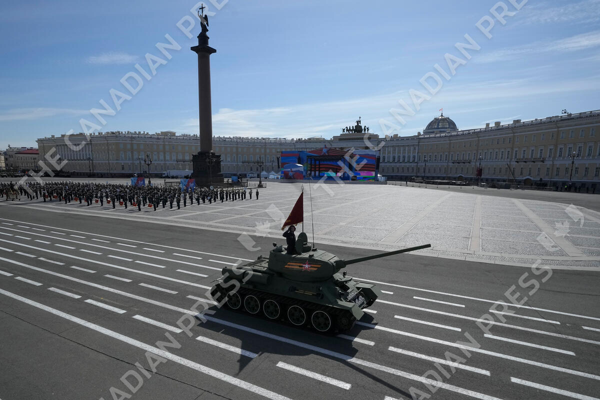 A World War II ages Soviet army T-34 tank rolls during the Victory Day military parade at Dvortsovaya (Palace) Square to celebrate 78 years after the victory in World War II in St. Petersburg, Russia, Tuesday, May 9, 2023. (AP Photo/Dmitri Lovetsky)