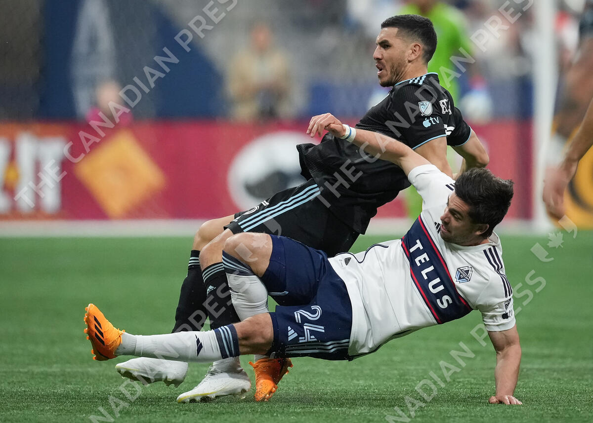 Vancouver Whitecaps' Brian White, front, and Minnesota United's Michael Boxall vie for the ball during the first half of an MLS soccer match in Vancouver, B.C., Saturday, May 6, 2023. THE CANADIAN PRESS/Darryl Dyck