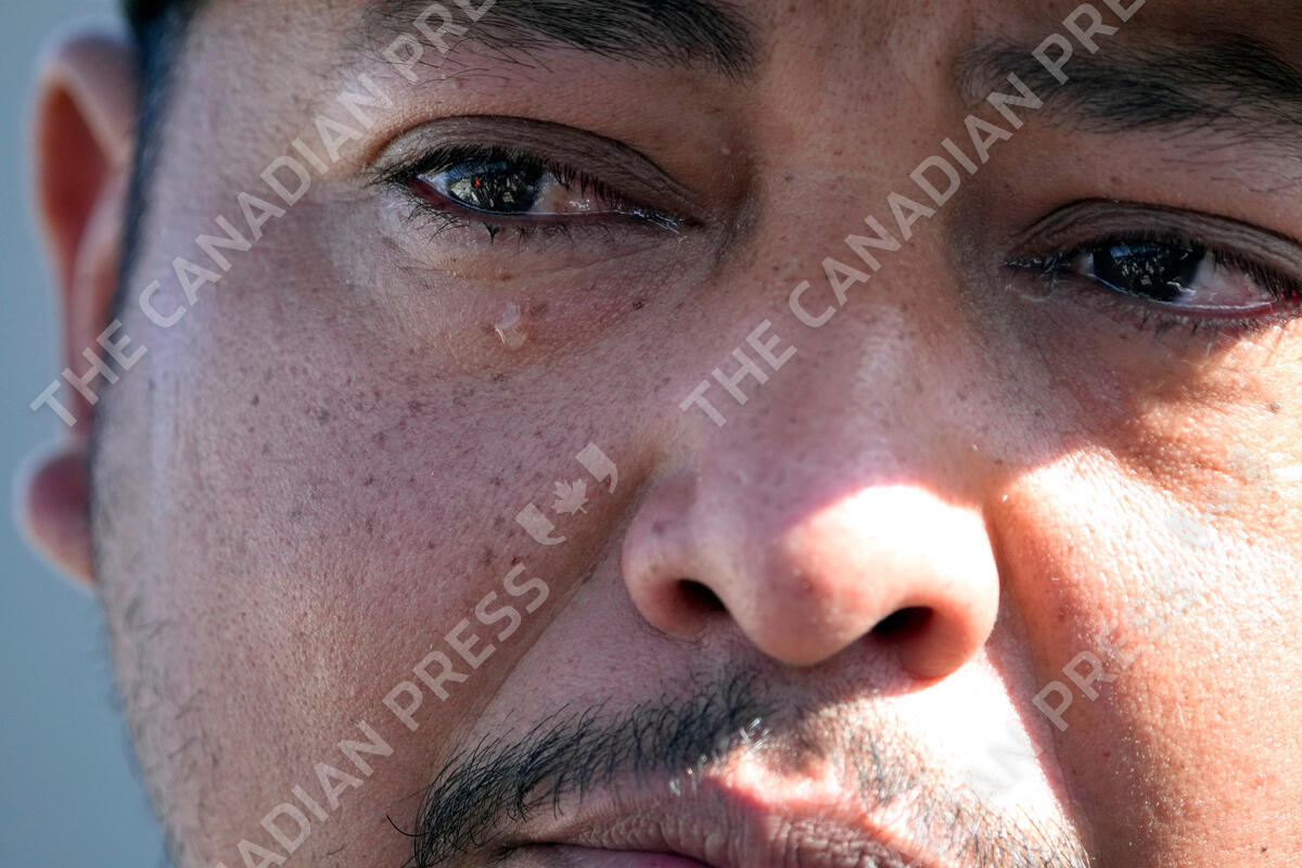 Mass shooting survivor Wilson Garcia sheds a tear as he talks about his wife and son, who were killed in Friday's shooting, Sunday, April 30, 2023, at a vigil for his son in Cleveland, Texas. Garcia recalls that he and his family dialed 911 five times in all, with the dispatcher assuring them each time that help was coming. He estimated that between 10 and 20 minutes passed from when he first spoke to Francisco Oropeza to when the man arrived at his front door and began shooting. (AP Photo/David J. Phillip)