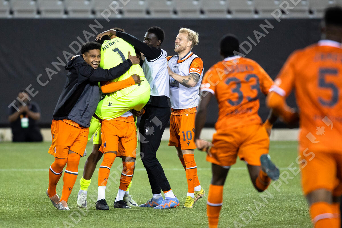 Forge FC teammates celebrate after defeating Atletico Ottawa on penalties during the Canadian Championship quarterfinal at Tim Hortons Field in Hamilton, Tuesday, May 9, 2023. THE CANADIAN PRESS/Nick Iwanyshyn