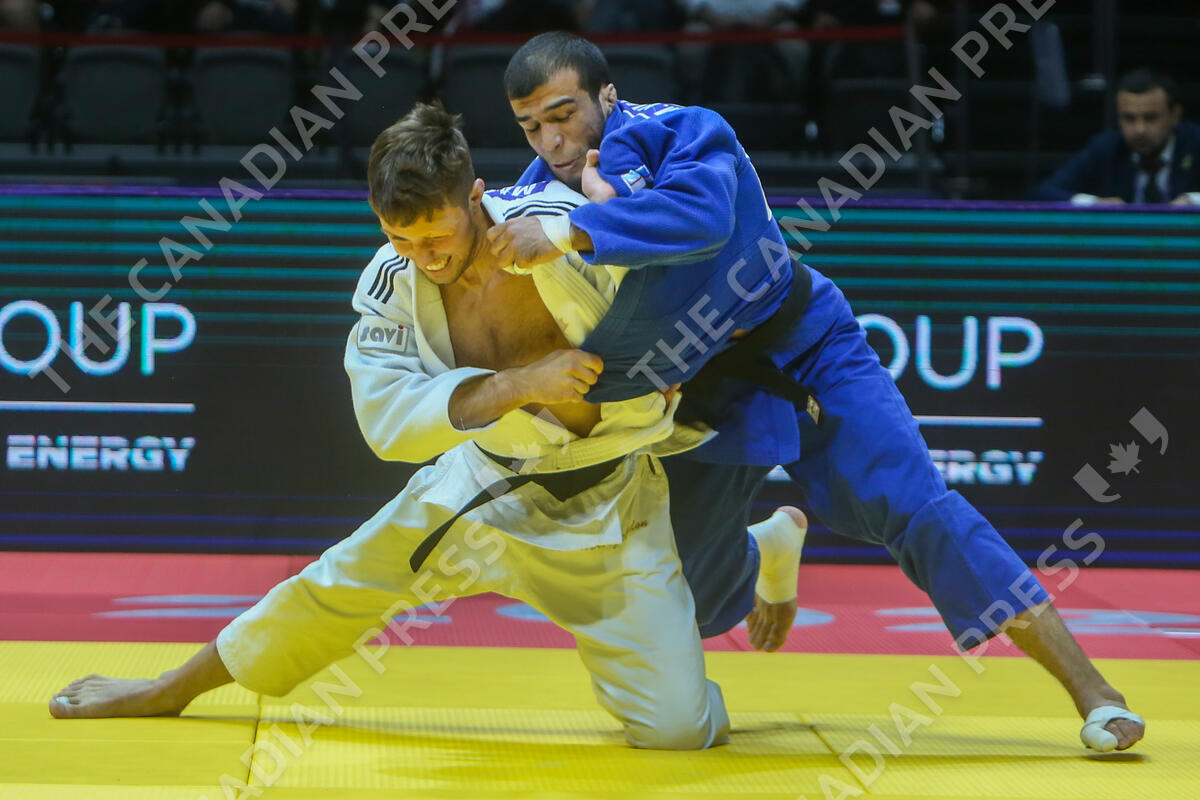 Arthur Margelidon of Canada, in white, and Murodjon Yuldoshev of Uzbekistan compete during a men's -73 kilogram bronze medal judo match at the World Judo Championships in Doha, Qatar, Tuesday, May 9, 2023. (AP Photo/Hussein Sayed)