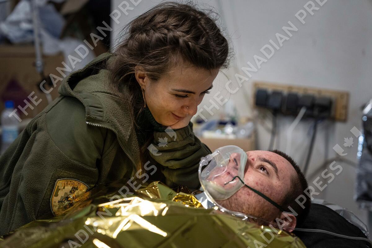 A Ukrainian military medic speaks to her wounded comrade at the field hospital near Bakhmut, Ukraine, Sunday, Feb. 26, 2023. (AP Photo/Evgeniy Maloletka)