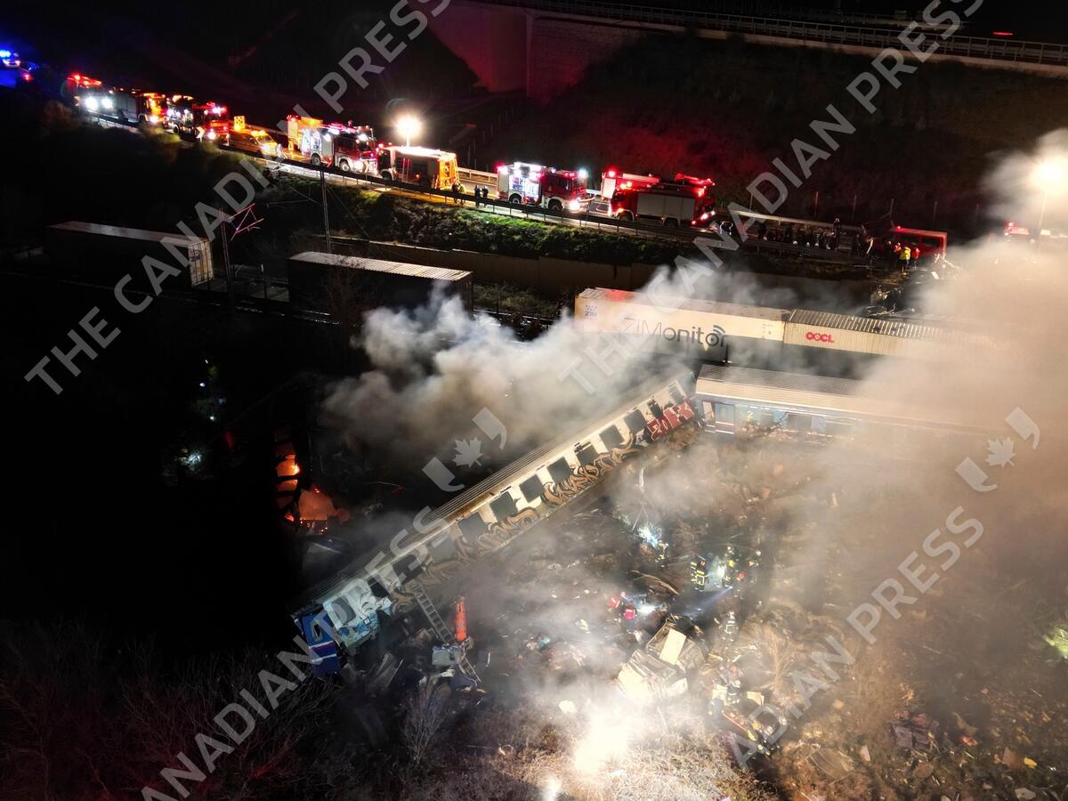 Smoke rises from trains as firefighters and rescuers operate after a collision near Larissa city, Greece, early Wednesday, March 1, 2023. The collision between a freight and passenger train occurred near Tempe, some 380 kilometers (235 miles) north of Athens, and resulted in the derailment of several train cars. (AP Photo/Vaggelis Kousioras)
