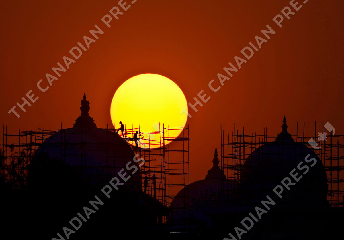 Workers are silhouetted against the setting sun at a construction site of a new Telangana State Secretariat building in Hyderabad, India, Tuesday, Feb. 28, 2023. (AP Photo/Mahesh Kumar A.)