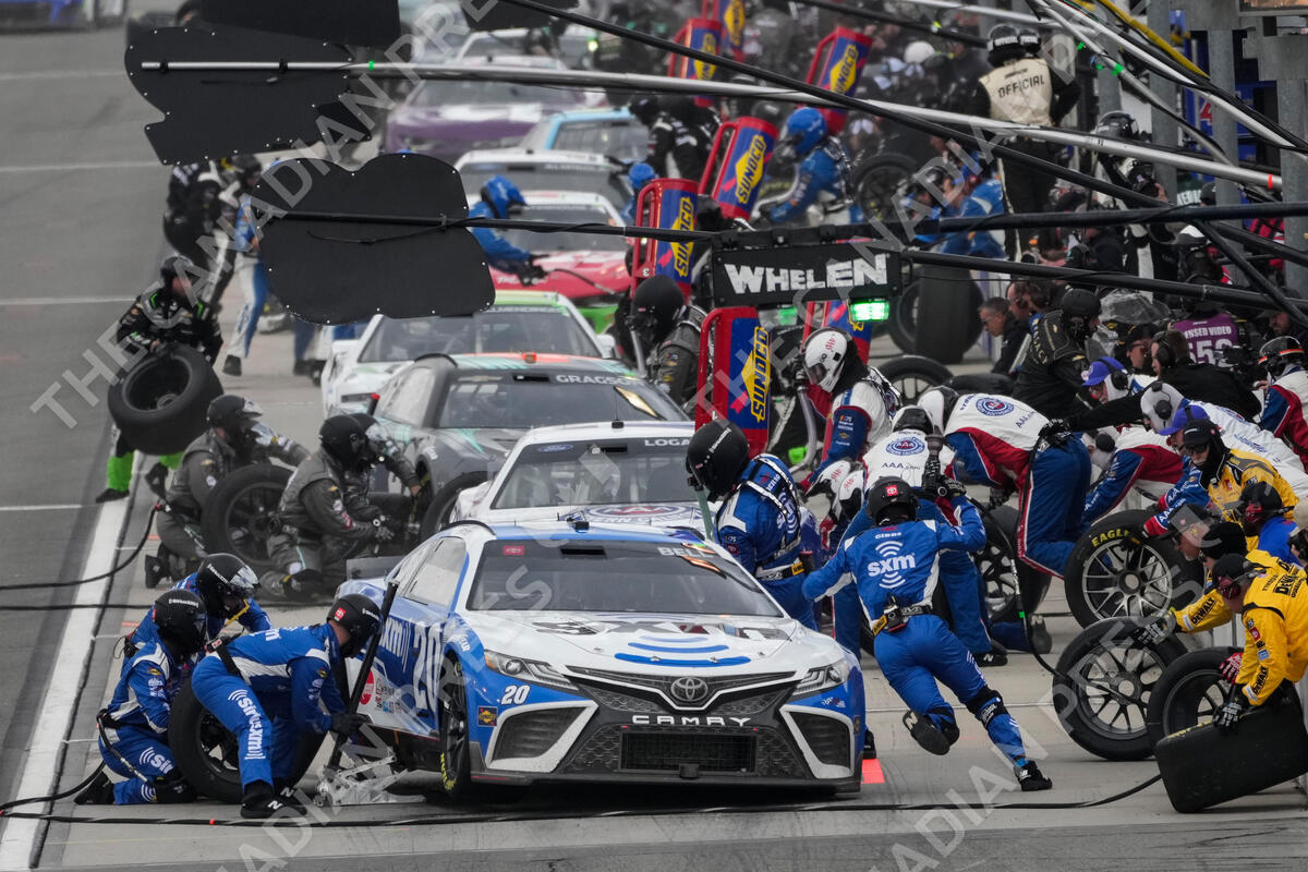 Christopher Bell (20) makes a pit stop during a NASCAR Cup Series auto race at Auto Club Speedway in Fontana, Calif., Sunday, Feb. 26, 2023. (AP Photo/Jae C. Hong)