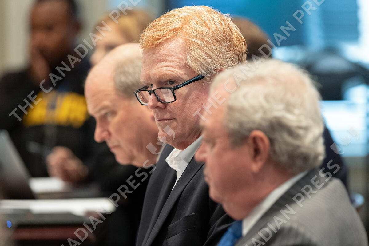 Alex Murdaugh listens as prosecutor Creighton Waters makes closing arguments during his double murder trial at the Colleton County Courthouse on Wednesday, March 1, in Walterboro, S.C. The 54-year-old attorney is standing trial on two counts of murder in the shootings of his wife and son at their Colleton County home and hunting lodge on June 7, 2021. (Joshua Boucher/The State via AP, Pool)
