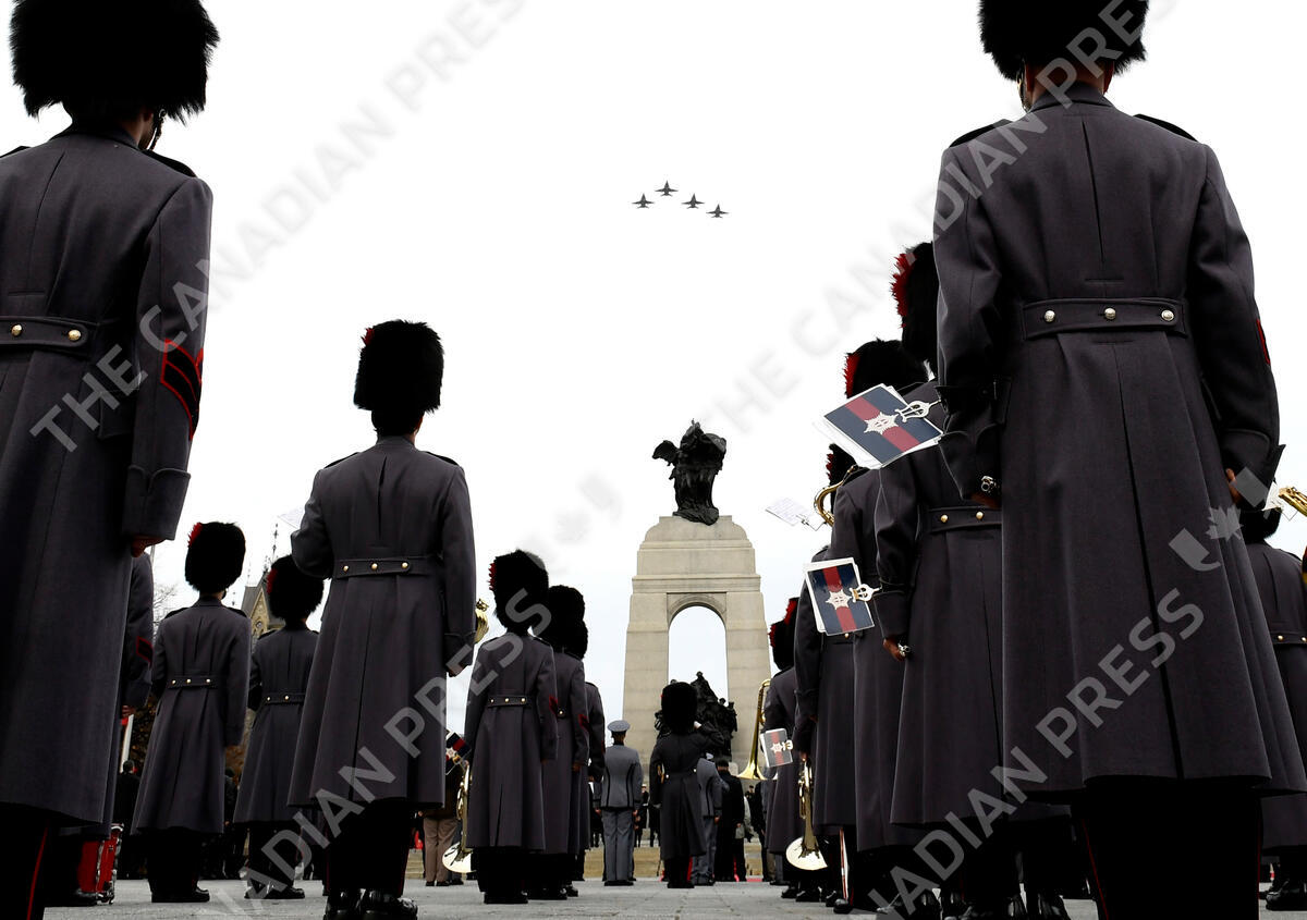 CF-18 Hornets perform a flypast at the National War Memorial during the National Remembrance Day Ceremony in Ottawa, on Friday, Nov. 11, 2022. THE CANADIAN PRESS/Justin Tang