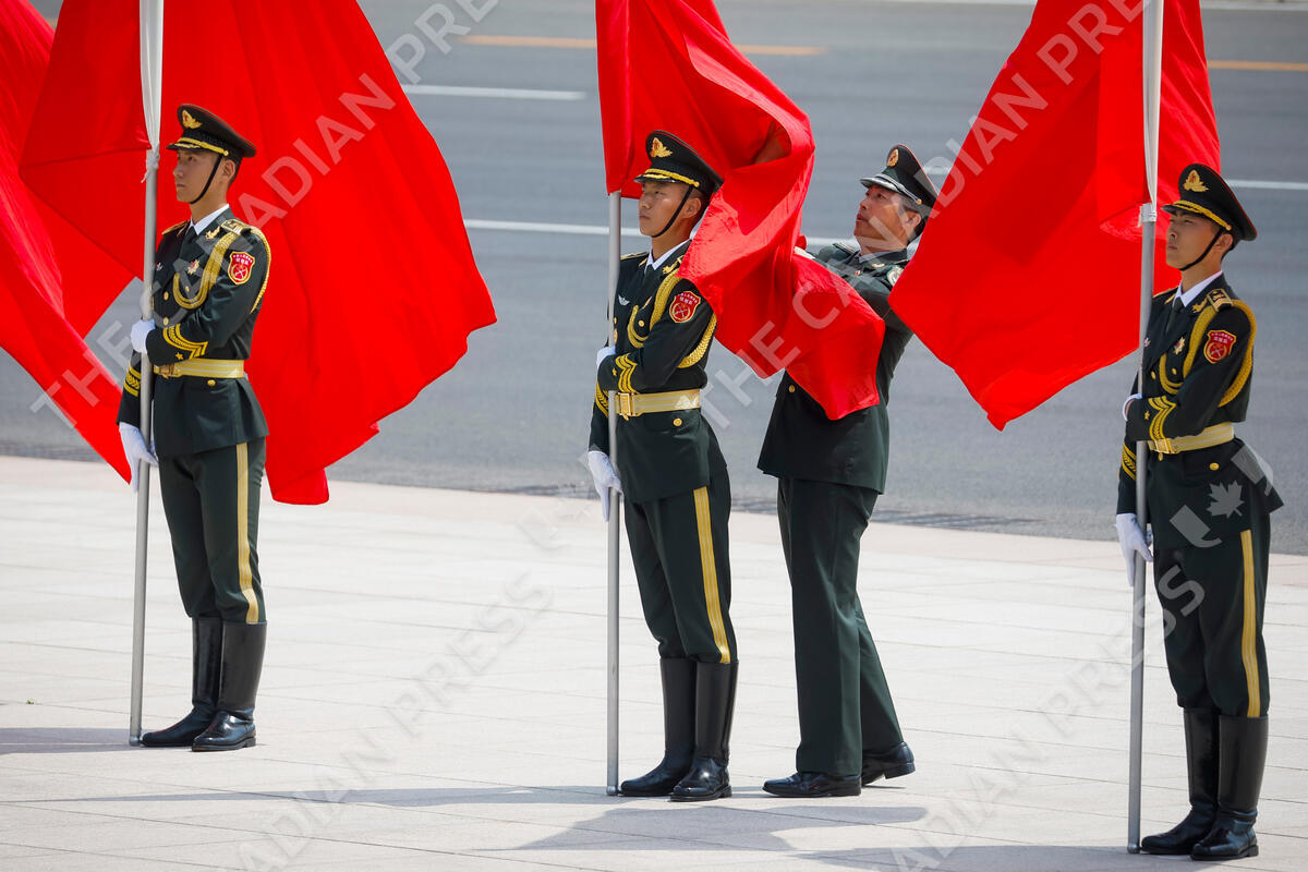 Members of a Chinese honor guard stand in formation before a welcoming ceremony for Russian Prime Minister Mikhail Mishustin in Beijing, China, Wednesday, May 24, 2023. (Thomas Peter/Pool Photo via AP)