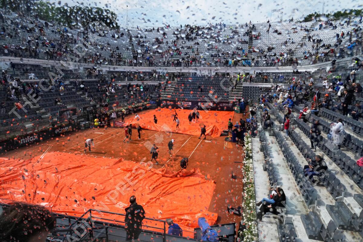 The rain cover is removed form the central court prior to the start of the final match between Denmark's Holger Rune and Russia's Daniil Medvedev at the Italian Open tennis tournament in Rome, Italy, Sunday, May 21, 2023. (AP Photo/Gregorio Borgia)