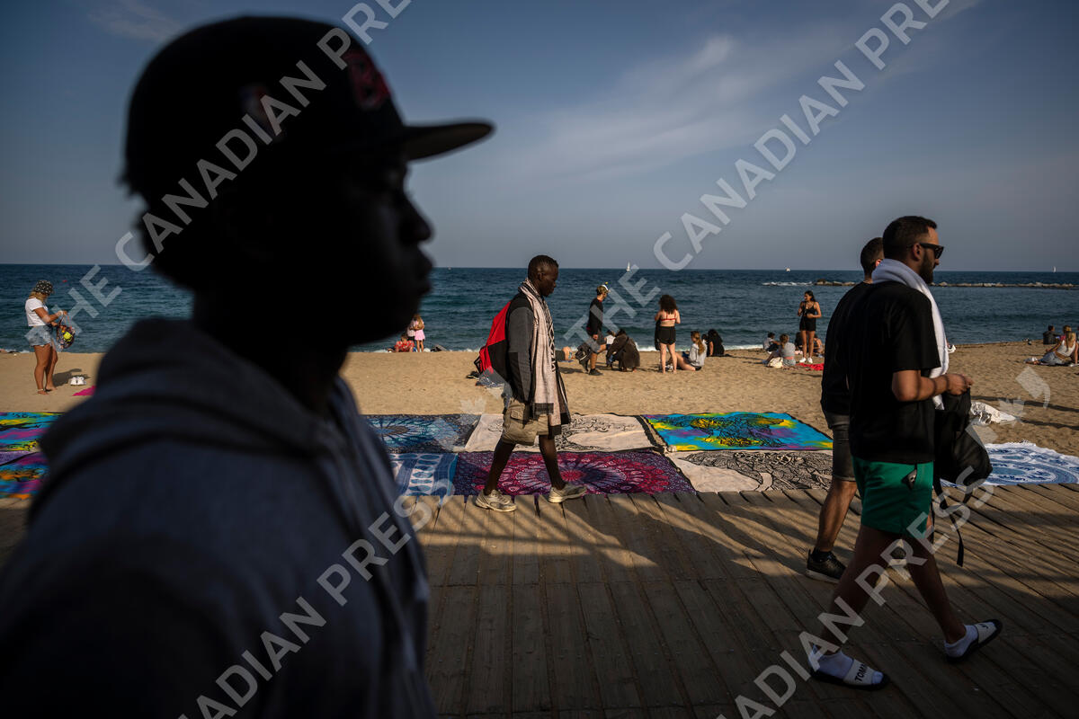 People walk past a street vendors selling fabrics at the beach in Barcelona, Spain, Tuesday, May 23, 2023. Repeated racist insults against Real Madrid's Brazilian soccer star Vincius Junior have unleashed a heated debate in Spain about tolerance for racism in a society that is becoming rapidly more diverse on and off the field. (AP Photo/Emilio Morenatti)