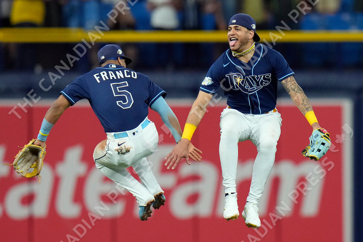 Tampa Bay Rays center fielder Jose Siri and shortstop Wander Franco (5) celebrate after the team defeated the Toronto Blue Jays during a baseball game Wednesday, May 24, 2023, in St. Petersburg, Fla. (AP Photo/Chris O'Meara)