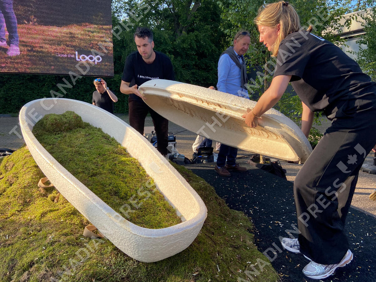 Director Lonneke Westhoff, right, and founder Bob Hendrikx, left, of Dutch startup Loop Biotech display one of the cocoon-like coffins, grown from local mushrooms and up-cycled hemp fibres, designed to dissolve into the environment amid growing demand for more sustainable burial practices, in Delft, Netherlands, Monday, May 22, 2023. A Dutch intrepid inventor is now “growing” coffins by putting mycelium, the root structure of mushrooms, together with hemp fiber in a special mold that, in a week, turns into what could basically be compared to the looks of an unpainted Egyptian sarcophagus. (AP Photo/Aleksandar Furtula)