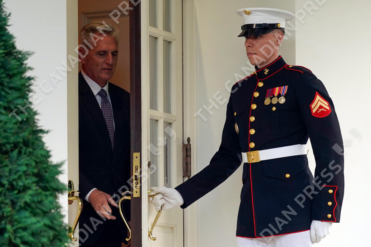 Speaker of the House Kevin McCarthy of Calif., exits the West Wing to talk with reporters after meeting with President Joe Biden at the White House, Monday, May 22, 2023, in Washington. (AP Photo/Evan Vucci)
