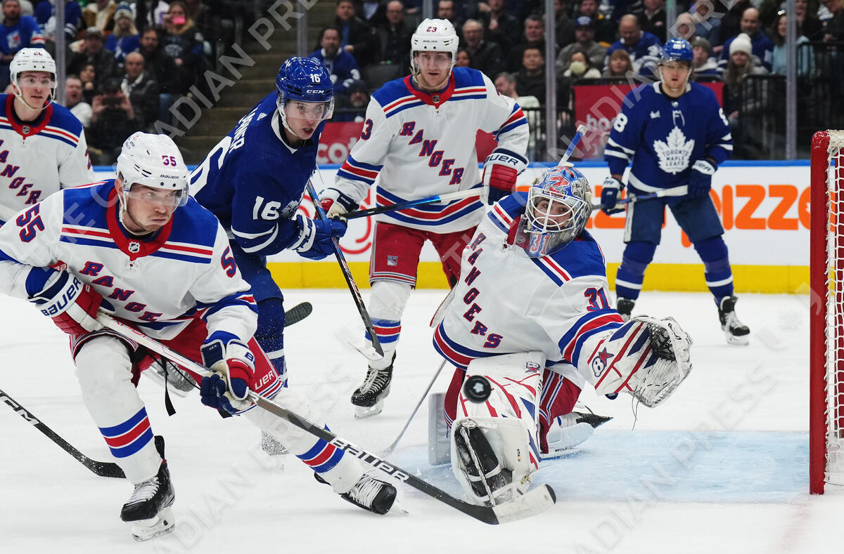 New York Rangers goaltender Igor Shesterkin (31) makes a save as Toronto Maple Leafs forward Mitchell Marner (16) and Rangers defenceman Ryan Lindgren (55) look on during second period NHL hockey action in Toronto on Wednesday, January 25, 2023. THE CANADIAN PRESS/Nathan Denette