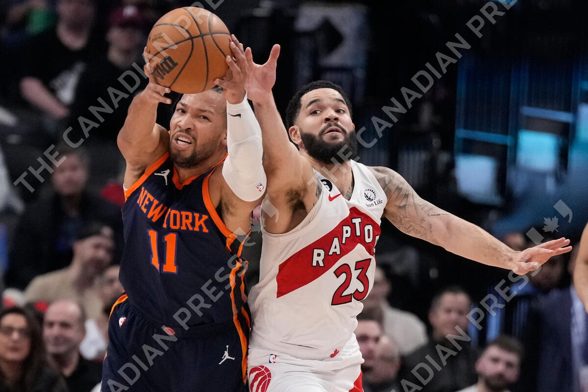 New York Knicks guard Jalen Brunson (11) and Toronto Raptors guard Fred VanVleet (23) battle for a loose ball during first half NBA basketball action in Toronto on Sunday, Jan. 22, 2023. THE CANADIAN PRESS/Frank Gunn