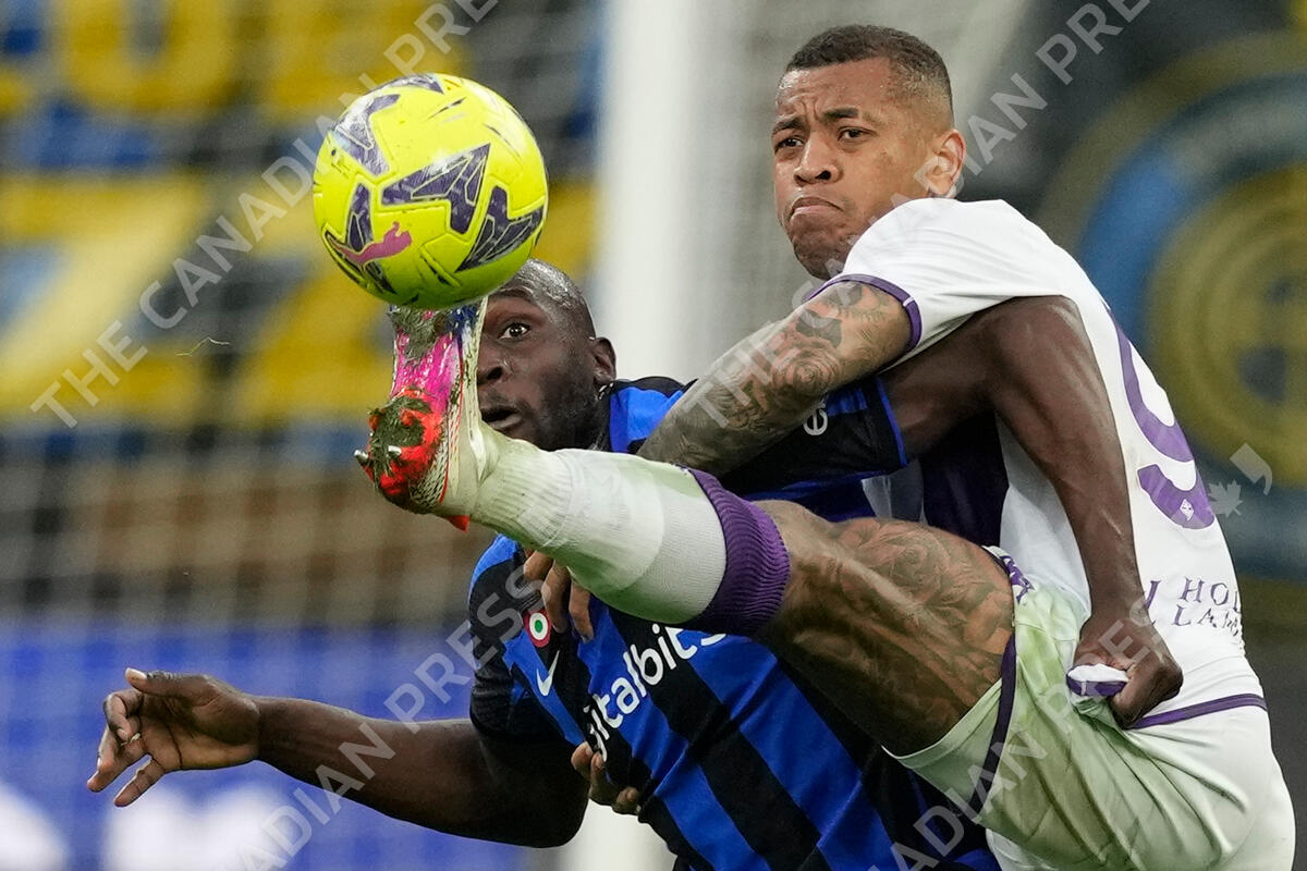 Inter Milan's Romelu Lukaku, left, and Fiorentina's Igor fight for the ball during a Serie A soccer match between Inter Milan and Fiorentina, at the San Siro Stadium, in Milan, Saturday, April 1, 2023. (AP Photo/Antonio Calanni)
