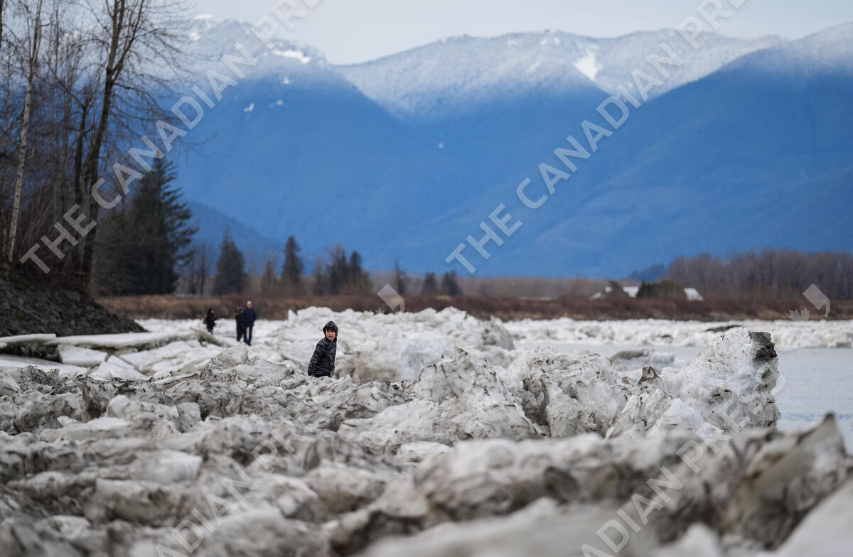 A young boy climbs on massive slabs of ice that have built up on the shore of the Fraser River between Agassiz and Chilliwack, B.C., after a snap of unseasonably cold weather last month, Monday, Jan. 2, 2023. THE CANADIAN PRESS/Darryl Dyck