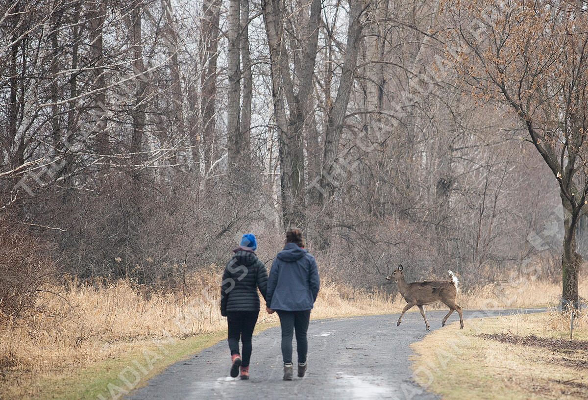 A deer crosses paths with walkers in the Boucherville nature park south of Montreal, Monday, January 2, 2023, as mild weather continues in the region. THE CANADIAN PRESS/Graham Hughes