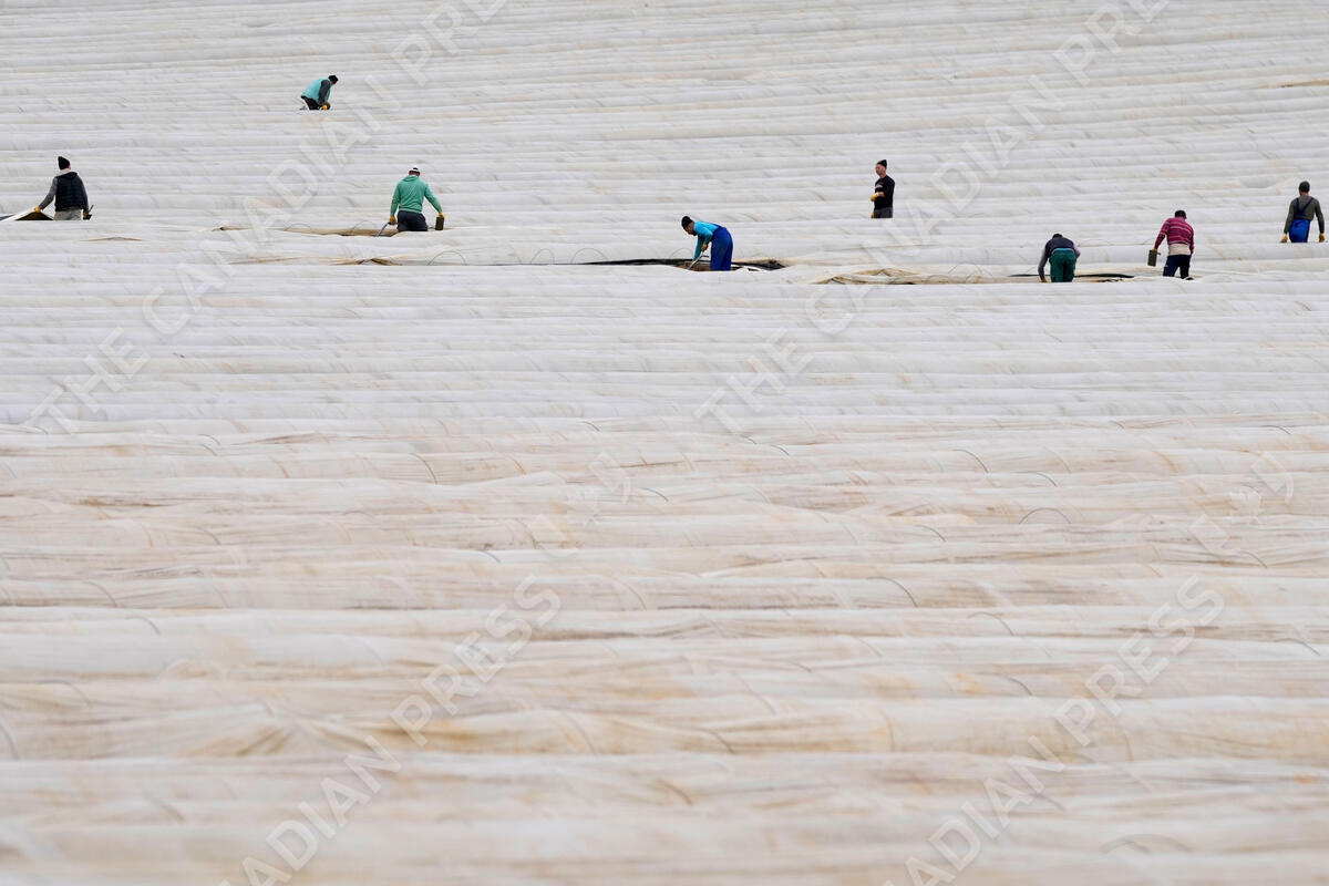 Workers cut asparagus in a field near Schrobenhausen, Germany, Thursday, April 27, 2023. (AP Photo/Matthias Schrader)
