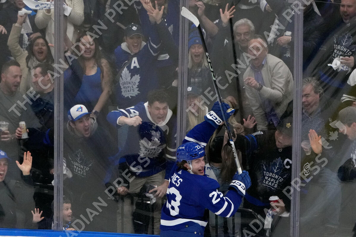 Toronto Maple Leafs left wing Matthew Knies (23) celebrates his goal during second period, second round, game one, NHL Stanley Cup hockey action against the Florida Panthers, in Toronto, Tuesday, May 2, 2023. THE CANADIAN PRESS/Chris Young