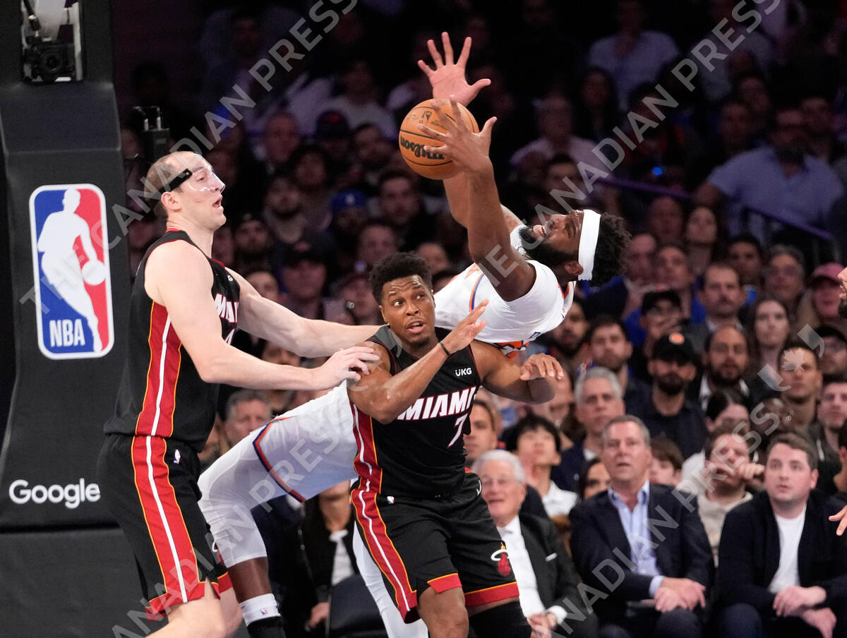 Miami Heat center Cody Zeller, left, watches New York Knicks center Mitchell Robinson fall over Miami Heat guard Kyle Lowry (7) while fighting for a rebound in the first half of Game 2 in the NBA basketball Eastern Conference semifinals playoff series, Tuesday, May 2, 2023, at Madison Square Garden in New York. (AP Photo/Mary Altaffer)