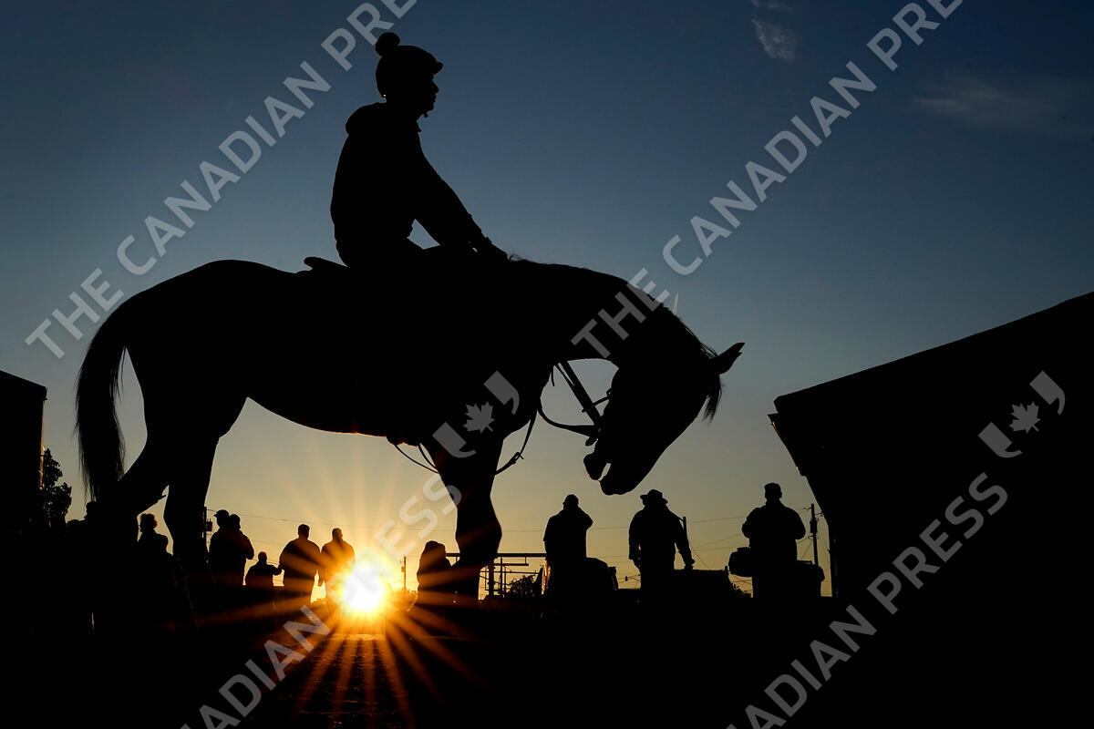 A horse comes off the track after a workout as the sun rises at Churchill Downs Wednesday, May 3, 2023, in Louisville, Ky. The 149th running of the Kentucky Derby is scheduled for Saturday, May 6. (AP Photo/Charlie Riedel)