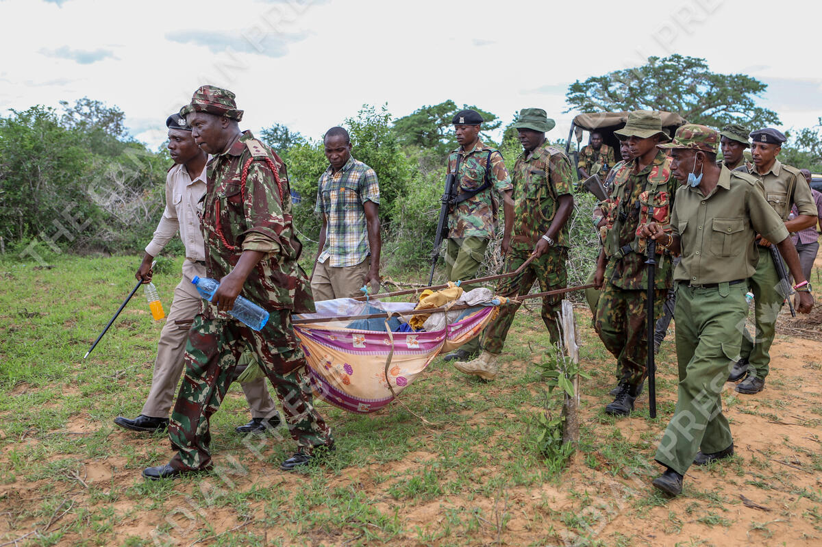 Police and local residents load the exhumed bodies of victims of a religious cult into the back of a truck in the village of Shakahola, near the coastal city of Malindi, in southern Kenya Sunday, April 23, 2023. Dozens of bodies have been discovered so far in shallow graves in a forest near land owned by a pastor Paul Makenzi in coastal Kenya who was arrested for telling his followers to fast to death. (AP Photo)