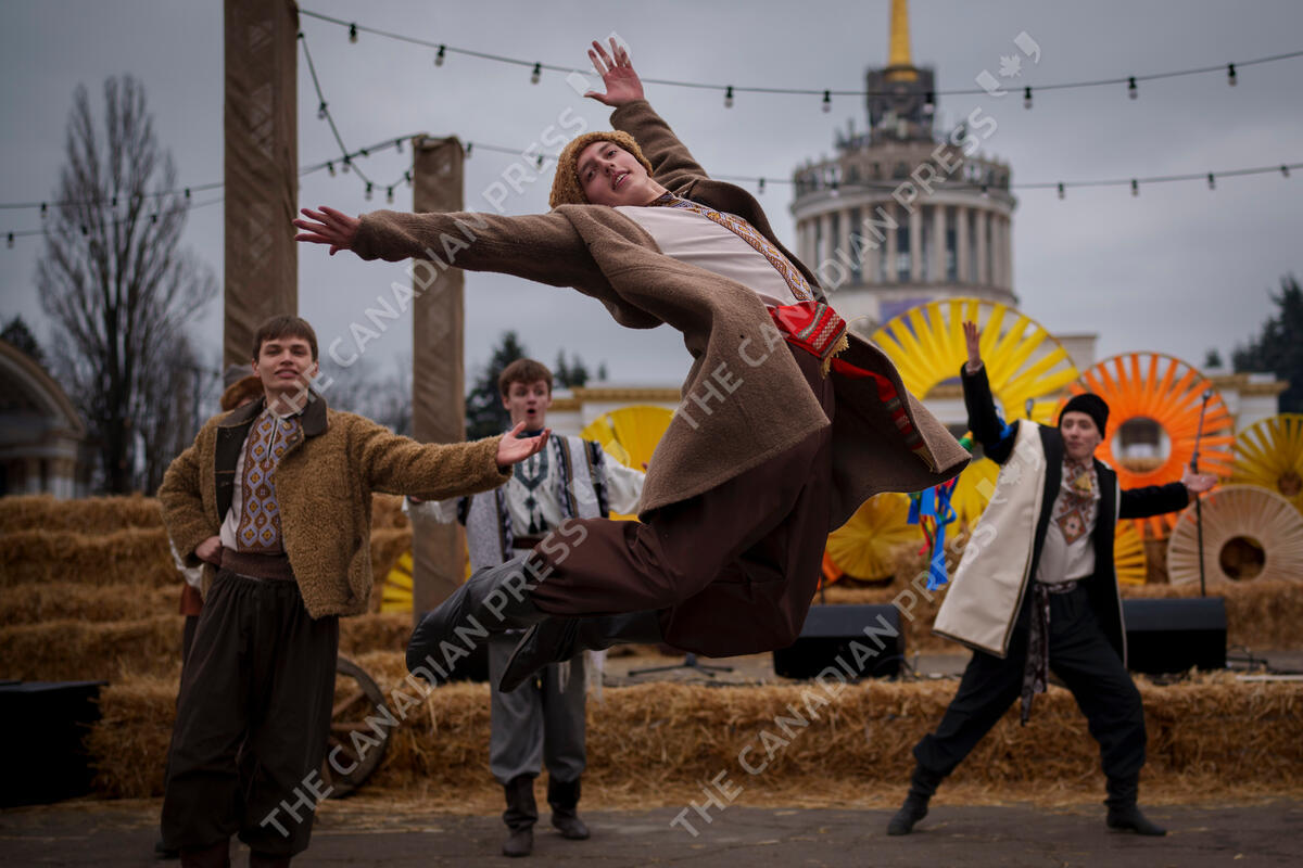 A young man dances during a show of traditions for Masnytsia, a holiday that originates in pagan times, celebrating the end of winter, in Kyiv, Ukraine, Saturday, March 16, 2024. (AP Photo/Vadim Ghirda)