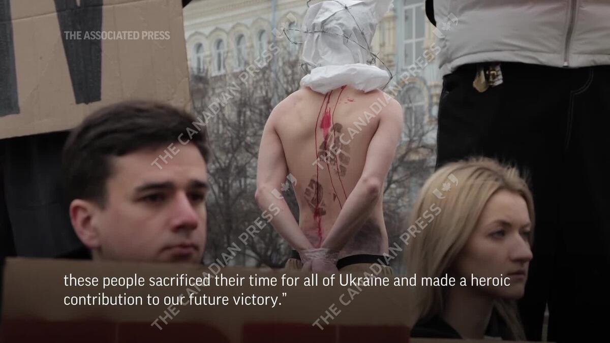 Hundreds of people joined a rally in Kyiv on Sunday to raise awareness on the fate of Ukrainian prisoners of war. Protesters at the rally, which was organized by the "Azovstal Families" group, called for renewed efforts to bring home Ukrainian troops taken into captivity. (AP Video by Anton Shtuka)