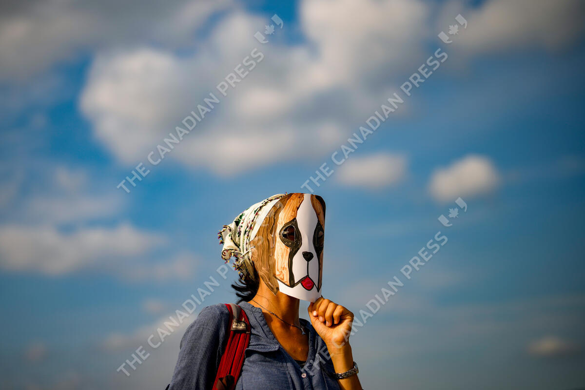 A woman wears a mask during a protest against a bill approved by Turkish legislators that aims to remove stray dogs off the country's streets, in Istanbul, Turkey, Sunday, Sept. 1, 2024. (AP Photo/Emrah Gurel)