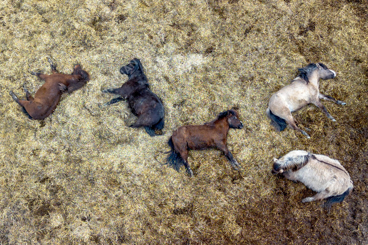 Icelandic horses sleep on straw at a stud farm in Wehrheim near Frankfurt, Germany, Friday, March 15, 2024. (AP Photo/Michael Probst)