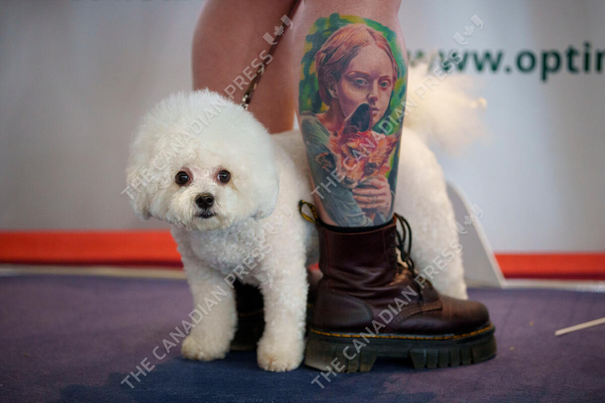 A dog sits next to his owner at the Pet Expo 2024, a pet show in Bucharest, Romania, Saturday, March 16, 2024. (AP Photo/Andreea Alexandru)