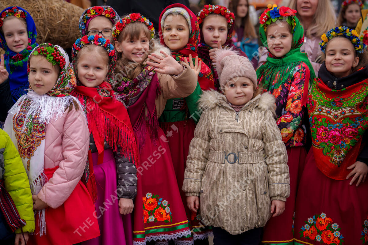 Children wearing traditional outfits wait before performing songs during a show of traditions for Masnytsia, a holiday that originates in pagan times, celebrating the end of winter, in Kyiv, Ukraine, Saturday, March 16, 2024. (AP Photo/Vadim Ghirda)