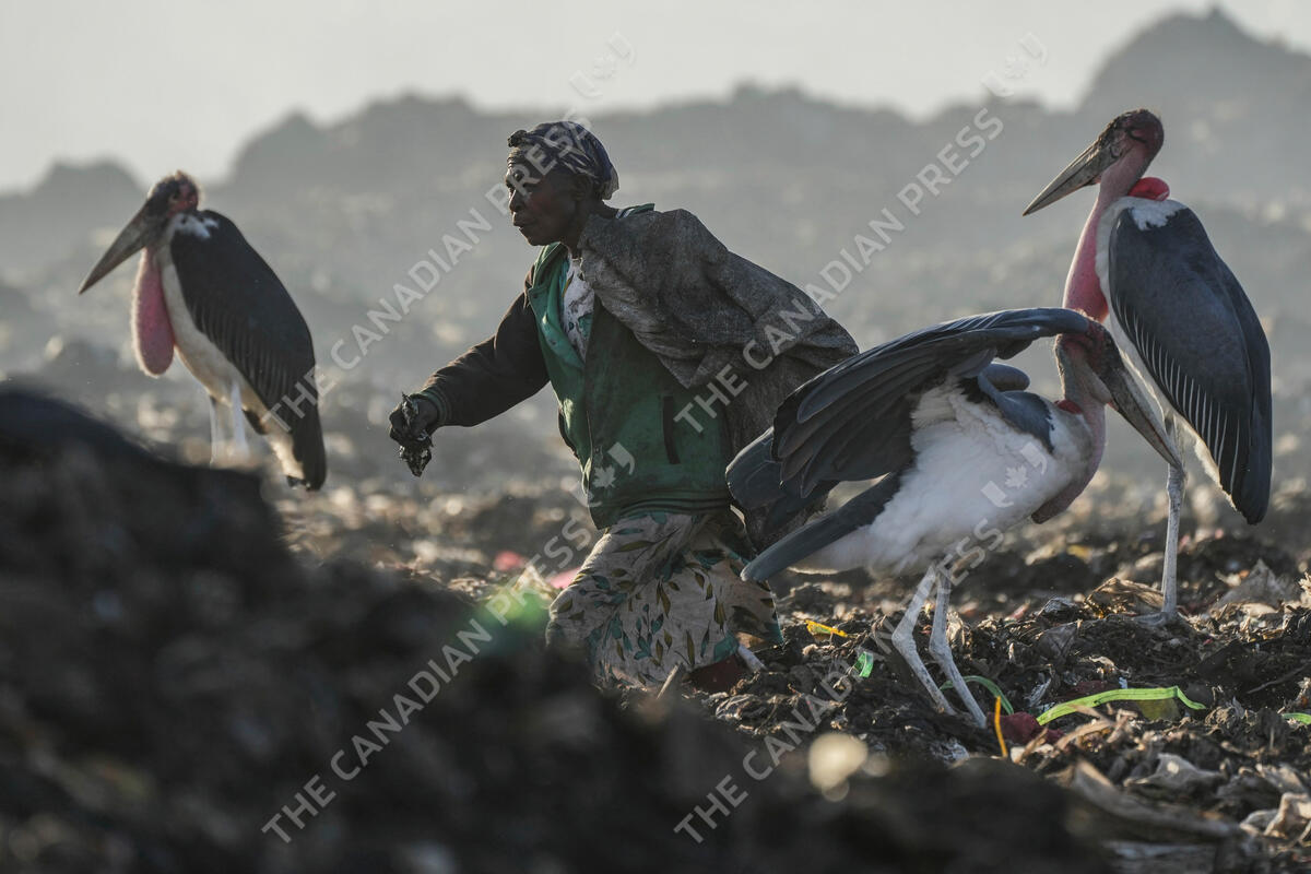 A woman who scavenges recyclable materials for a living, center, walks past Marabou storks feeding on a mountain of garage amidst smoke from burning trash at Dandora, the largest garbage dump in the capital Nairobi, Kenya Wednesday, March 20, 2024. U.N. agencies have warned that electrical and electronic waste is piling up worldwide while recycling rates continue to remain low and are likely to fall even further. (AP Photo/Brian Inganga)