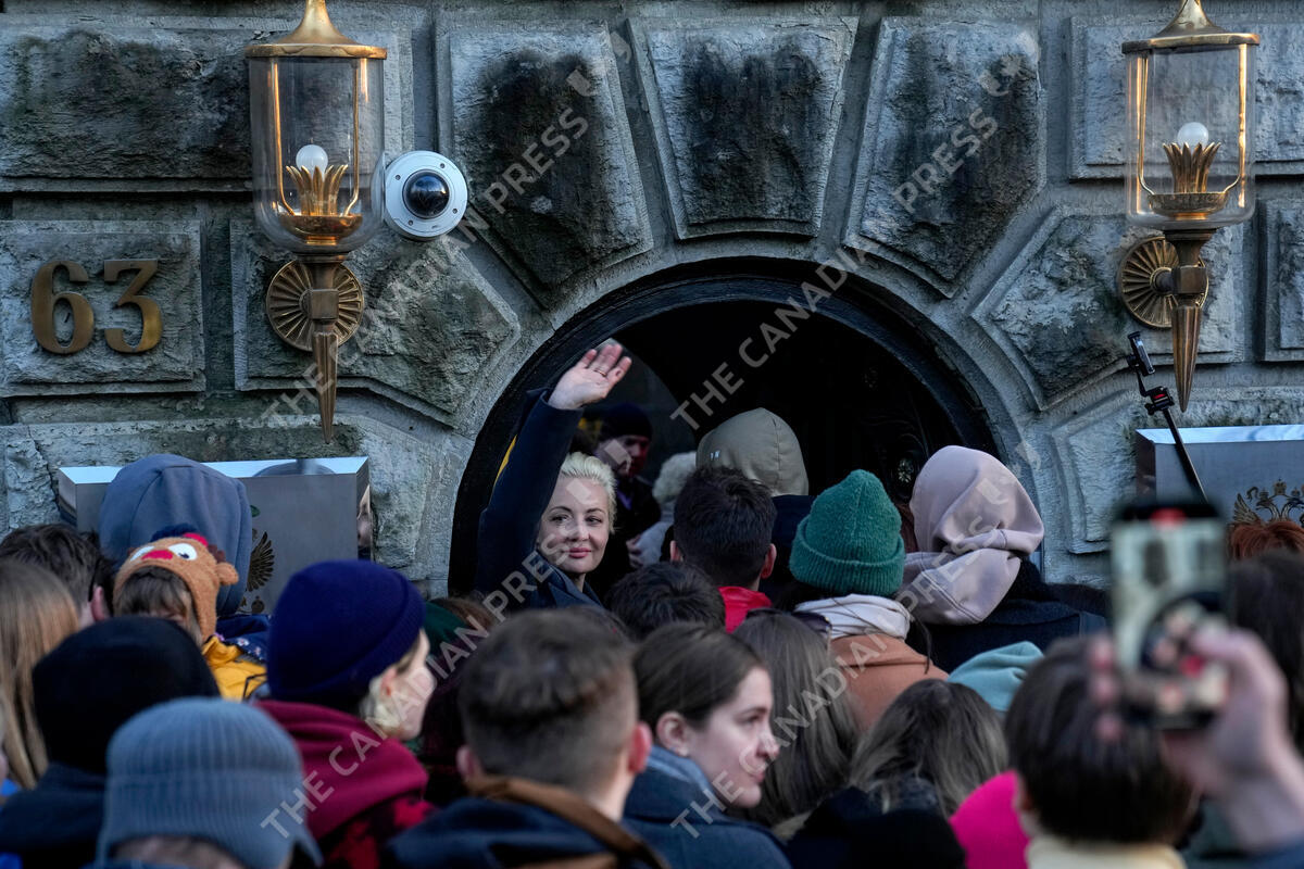 Yulia Navalnaya, centre, widow of Alexey Navalny, waves as she enters the Russian Embassy with other voters at a polling station in the Russian embassy in Berlin, after noon local time, on Sunday, March 17, 2024. The Russian opposition has called on people to head to polling stations at noon on Sunday in protest as voting takes place on the last day of a presidential election that is all but certain to extend President Vladimir Putin's rule after he clamped down on dissent. AP can't confirm that all the voters seen at the polling station at noon were taking part in the opposition protest. (AP Photo/Ebrahim Noroozi)