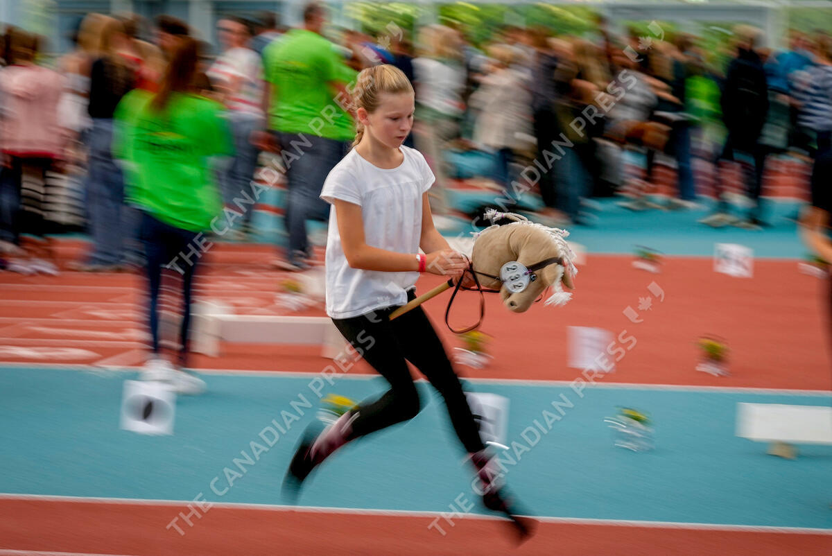 A participant competes in the dressage event at the first German Hobby Horsing Championship in Frankfurt, Germany, Saturday, Sept. 14, 2024. (AP Photo/Michael Probst)