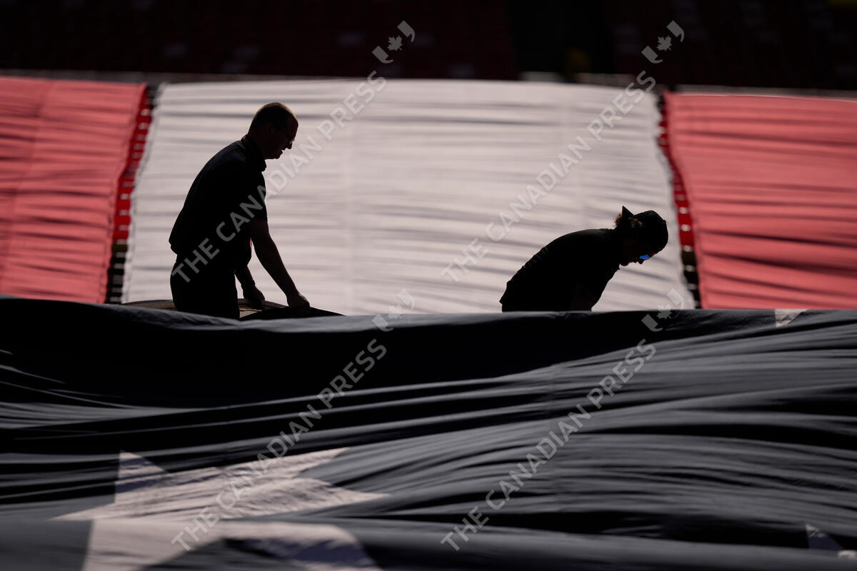 Workers prepare a large American flag on the field before an NFL football game between the Washington Commanders and the New York Giants in Landover, N.C., Sunday, Sept. 15, 2024. (AP Photo/Matt Slocum)