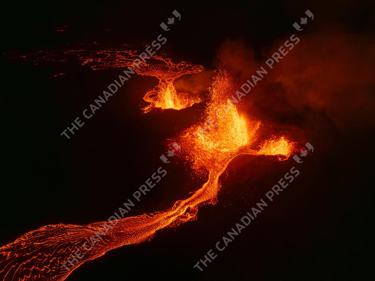 An aerial view of erupting craters and lava flows on the Reykjanes Peninsula, in Iceland, Aug. 29, 2024. (AP Photo/Marco di Marco)
