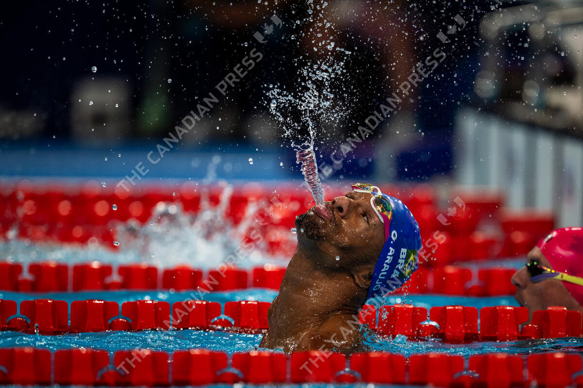 Paralympic athlete Araujo dos Santos, of Brazil, spits water to celebrate his victory in the men's 100-meter backstroke -S2 final, at the 2024 Paralympics, in Paris, Aug. 29, 2024. (AP Photo/Emilio Morenatti)