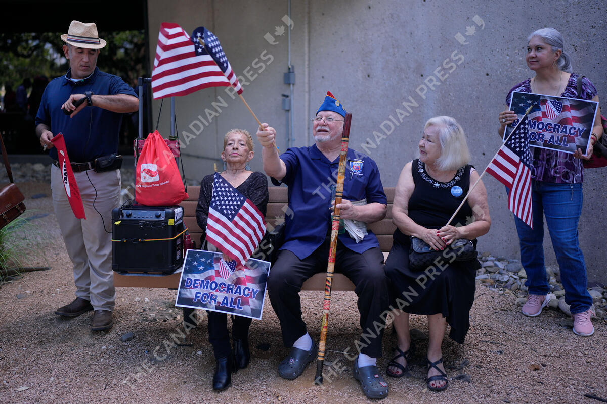 Roman Rena waves a flag where the League of United Latin American Citizens' officials held a news conference to respond to allegations of voter fraud by the state's attorney general, in San Antonio, Texas, Aug. 26, 2024. (AP Photo/Eric Gay)